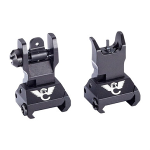 Made in the USA from mil-spec hard-anodized aluminum these sights are a rugged click adjustable option for your next AR rifle or pistol build.These high-quality folding front and rear sights easily clamp on any standard Picatinny rail and have a positive upright steel locking mechanism for rigid accurate durability under heavy use.The elevation adjustable front sight has a standard A2 front sight post and is compatible with most aftermarket front sights. The anti-snag rear sight is low profile finger adjustable for windage and has a dual peep with a .200" and .075" aperture.Features: Made in USA from mil-spec anodized aluminum Folding sights with a low profile when not in use Steel upright locking mechanism Standard AR-15 heights with low-profile windage adjustment and standard front sight elevation adjustment